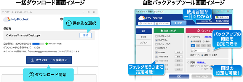 「マイポケット」に保存されている全てのデータを一括でダウンロードすることができるパソコン用のツールです。